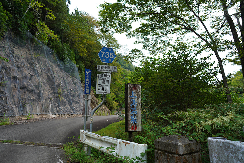 そこから奇絶峡を通り過ぎて国道425の南の県道735へ入り,十津川に抜けた.果無山脈のちょうど北の谷を流れる上湯川に沿っている.9年前にR425を通ったので今回は735にしたが,奈良県側が相変わらず細くて楽しい.が,林業が盛んで植林が多め.途中,岩を切り開いて強引に通した感じの箇所(引牛越など)がいくつもある.十津川に入って下北山へ抜けたかった(何度か走っている)けど今回は時間切れ.